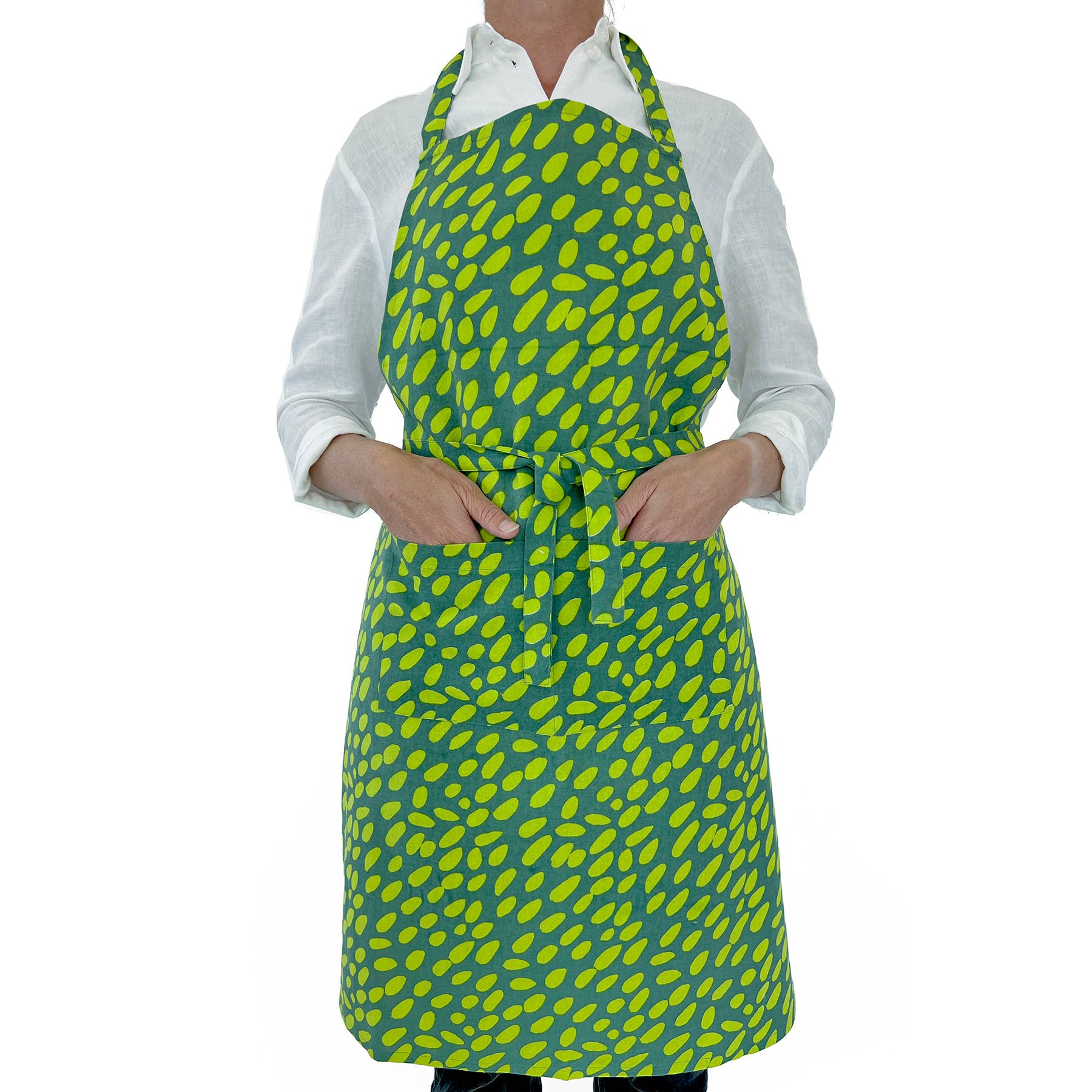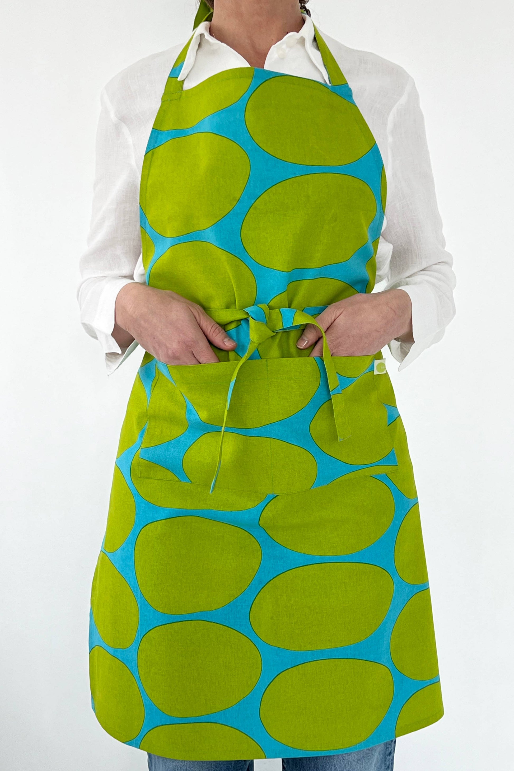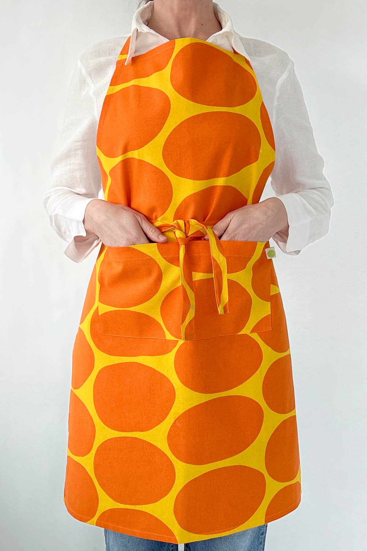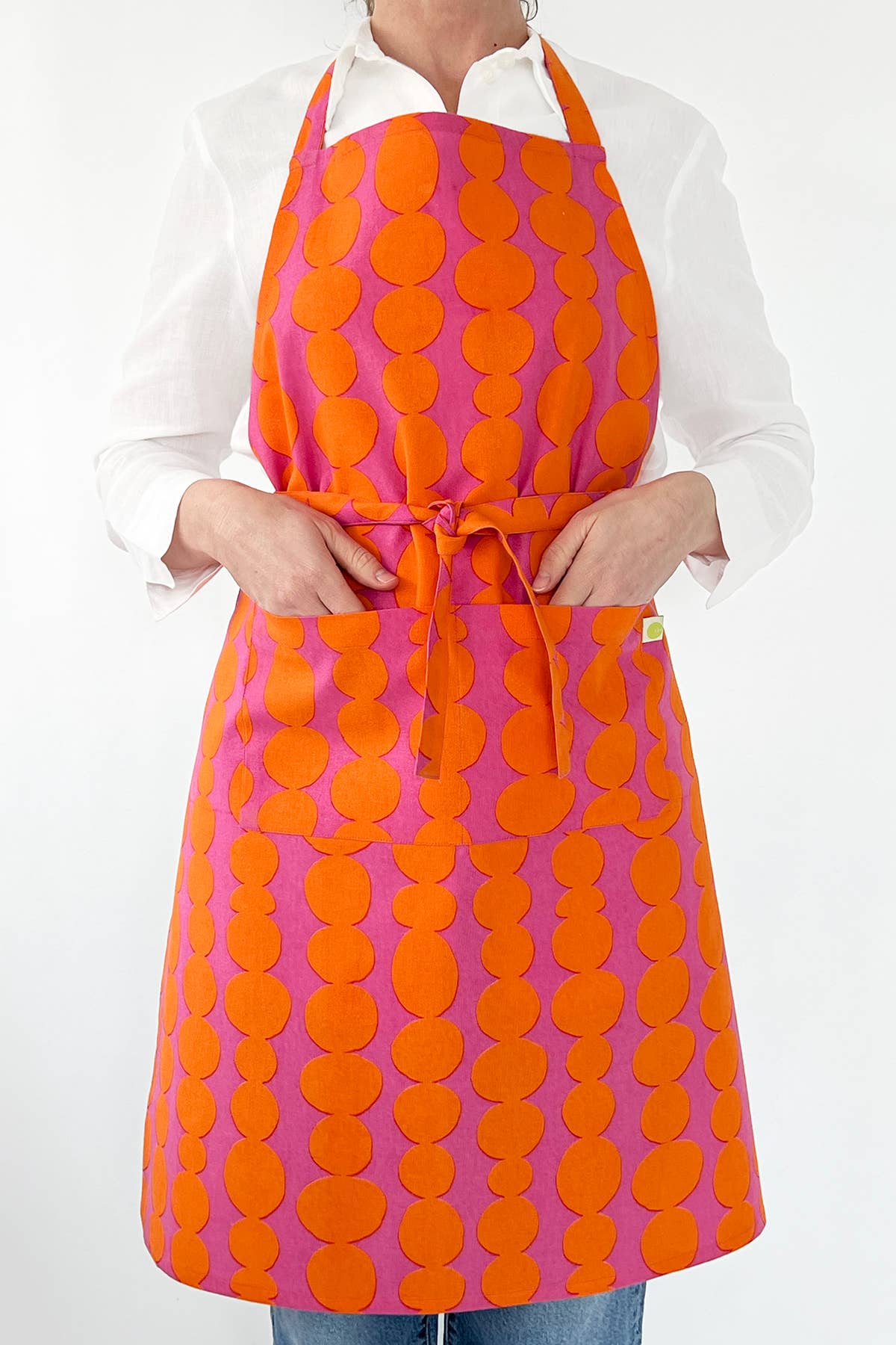 Donna Gorman's vibrant, hand-painted designs combine bold colors and prints for a perfect kitchen apron! Ties at the neck and waist provide a comfortable fit, and the divided front pocket adds a functional touch. Make cooking even more fun with these aprons! Coordinates with the tea towel collection to make a great gift bundle.