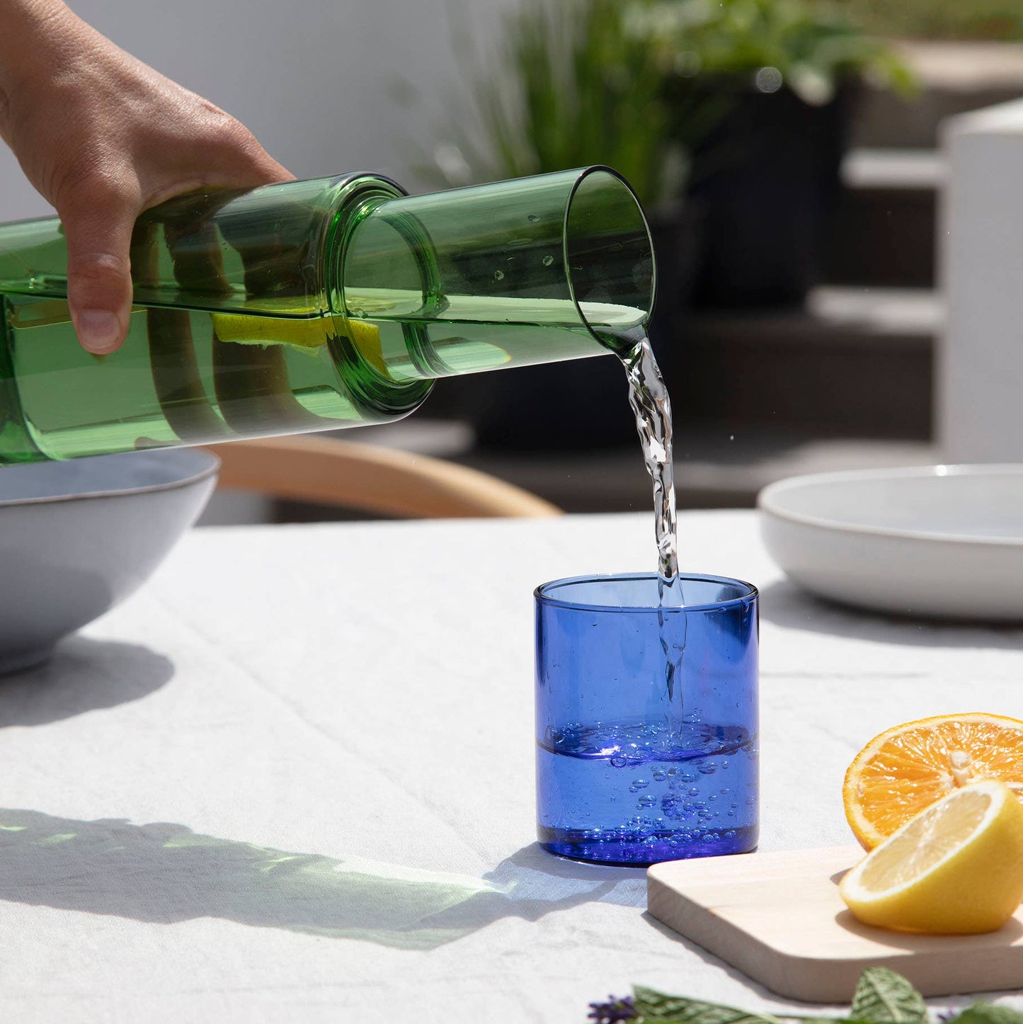 A carafe set that you will not want to hide in your cupboard. Handcrafted from food-grade borosilicate laboratory glass.