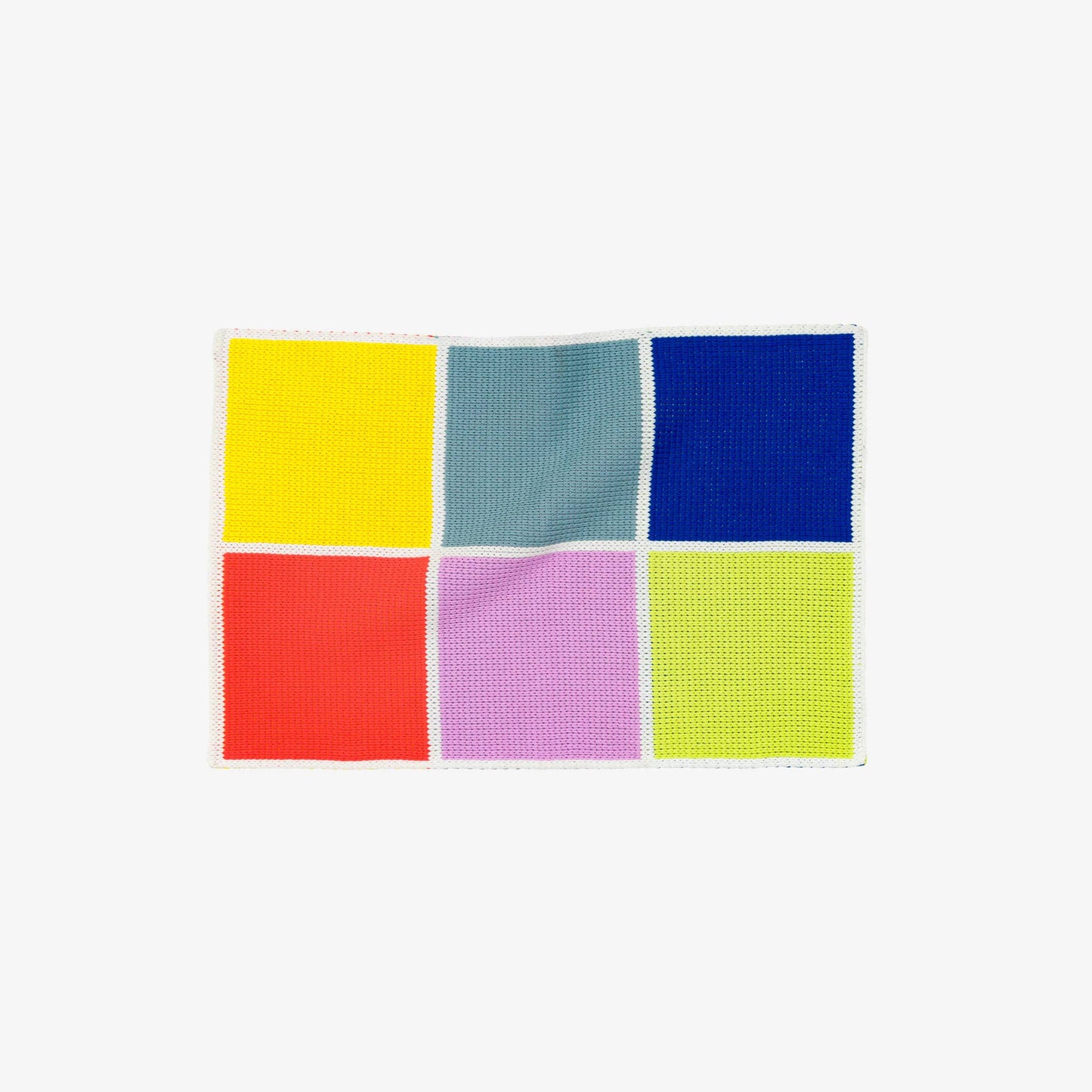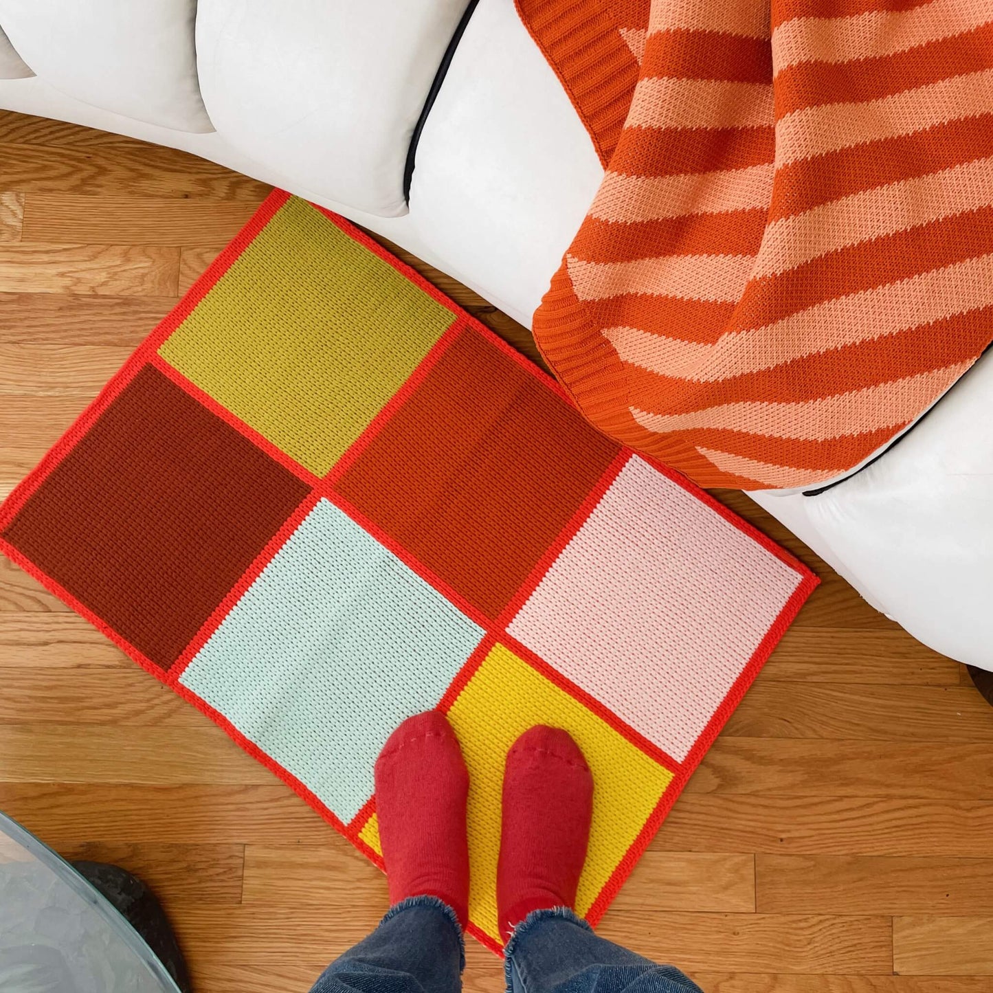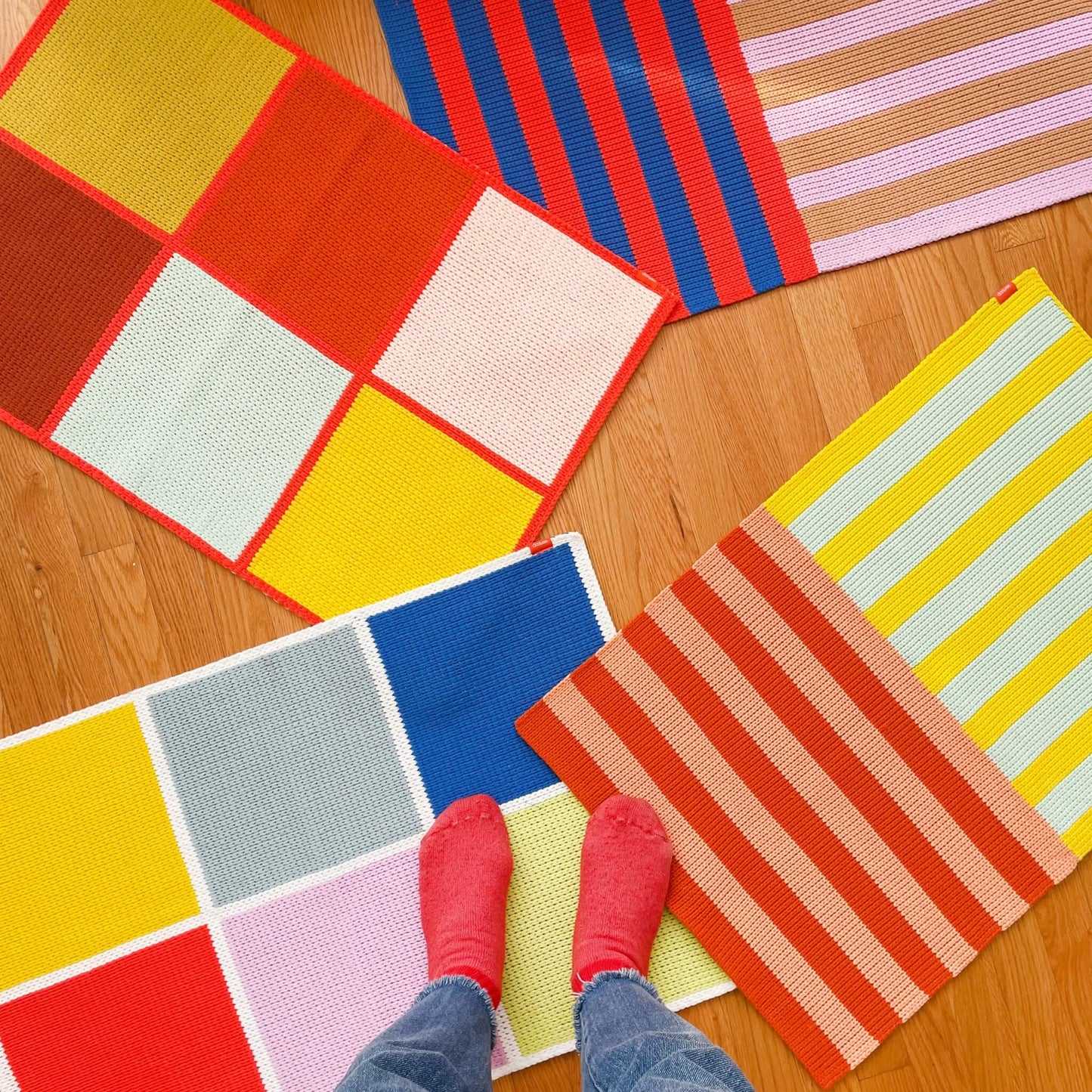 Durable patchwork mini rug with contrast outline for kitchen, bathroom, entryway, and more. Non-slip rug pad included. Knit with repurposed deadstock yarn.