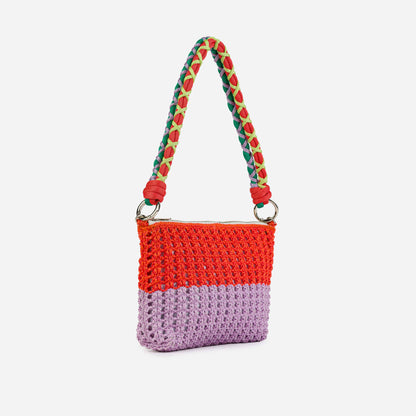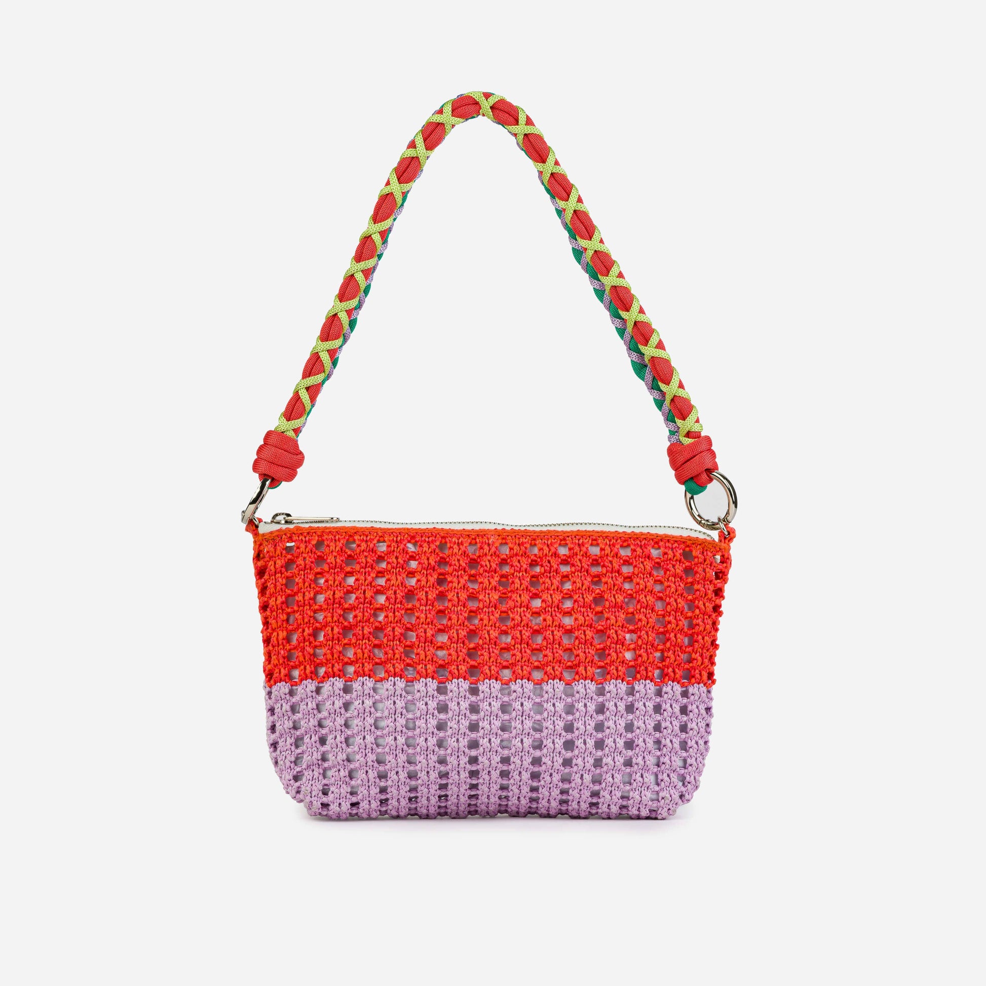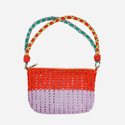 Add bold style to your day with this colorblock raffia zip bag. Sturdy crochet-style knit construction with zippered closure to keep everything secure. Knotted handle is made with repurposed deadstock yarn. Swap it out for a crossbody strap for even more versatility.