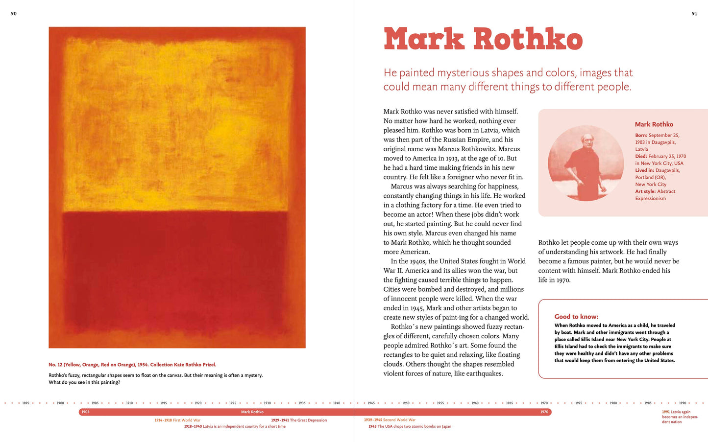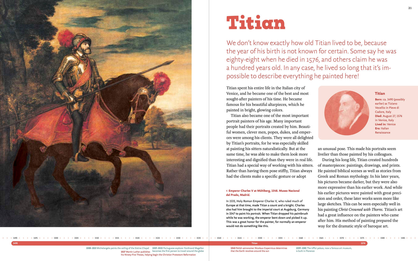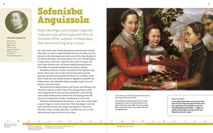 • In addition to widely known figures such as Leonardo da Vinci, Titian, Rembrandt, Vermeer, and Picasso, young readers will learn about women artists such as Sofonisba Anguissola, Georgia O’keeffe, Frida Kahlo, and Yayoi Kusama, and artists of color such as Jacob Lawrence, and Jean- Michel Basquiat.