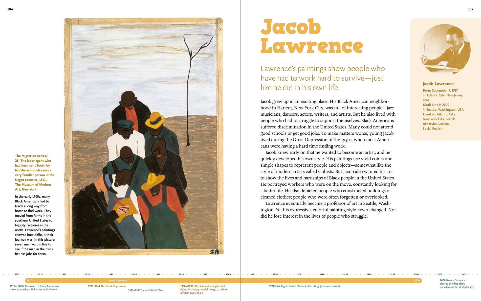 • Multi-page spreads that feature brief biographies, career highlights, and luminous reproductions of major works of each artist.
