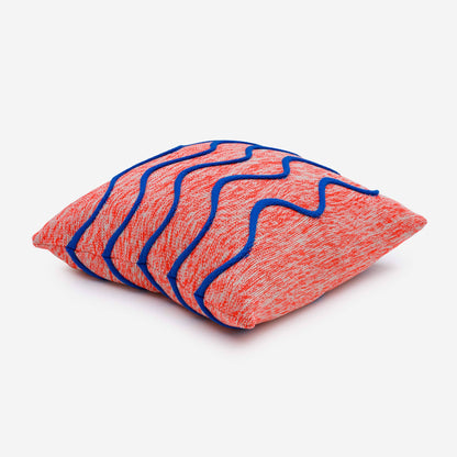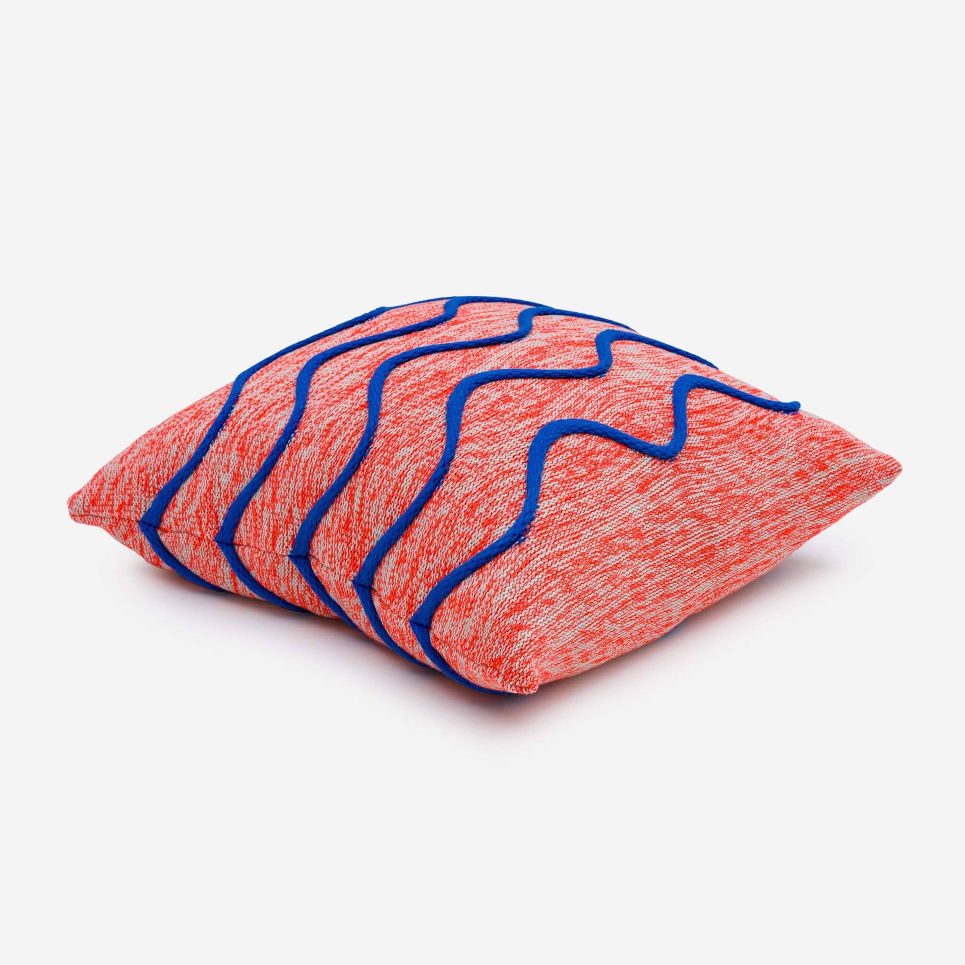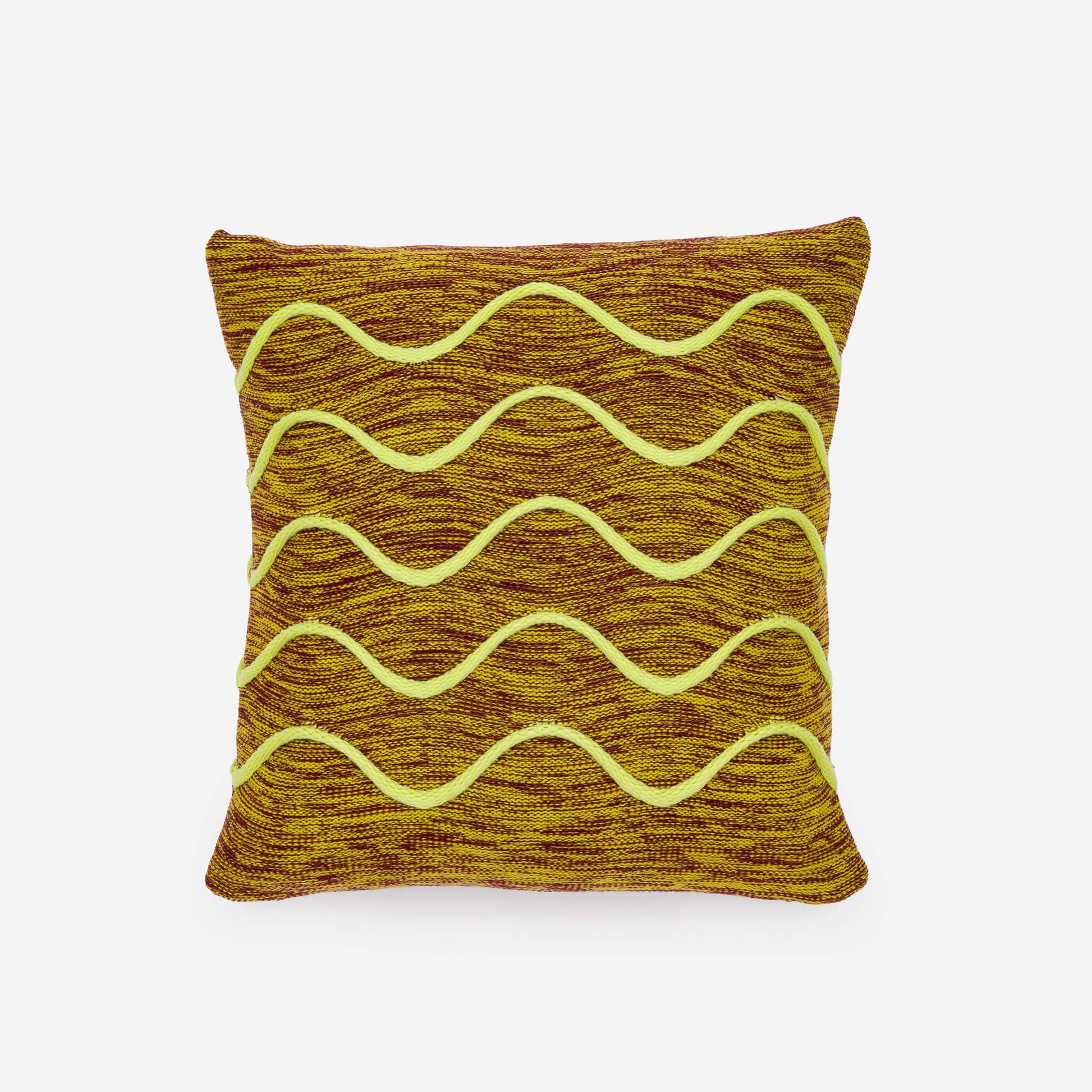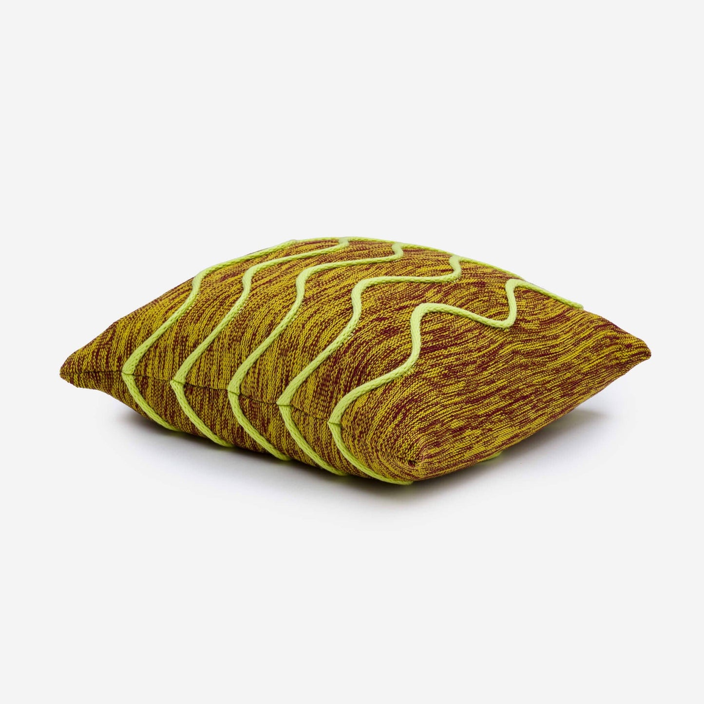 Two-tone knit pillow cover with dimensional squiggle cable stripes on front and back. Knit with new and repurposed deadstock yarn.