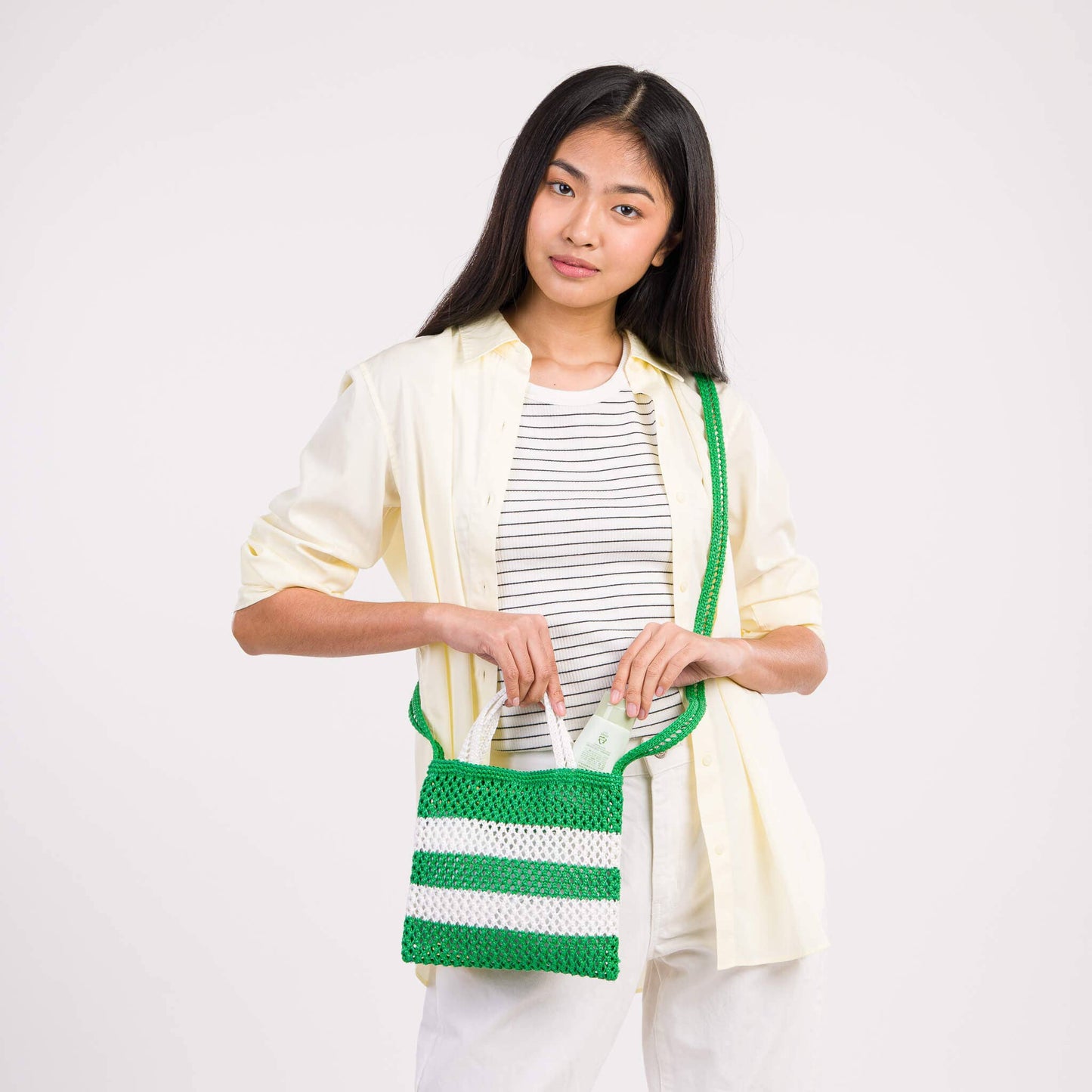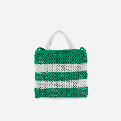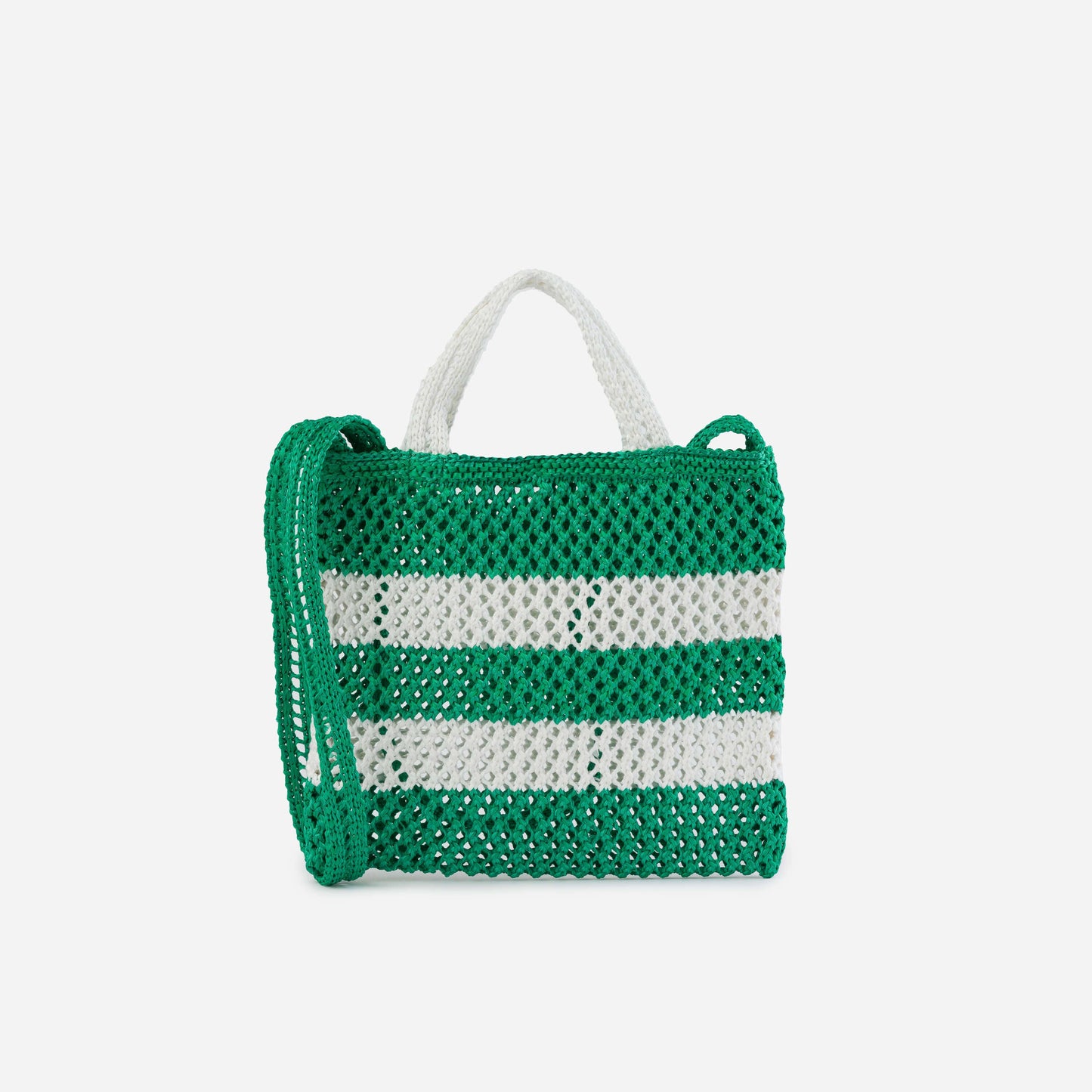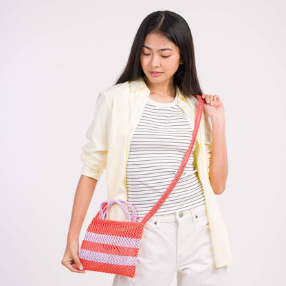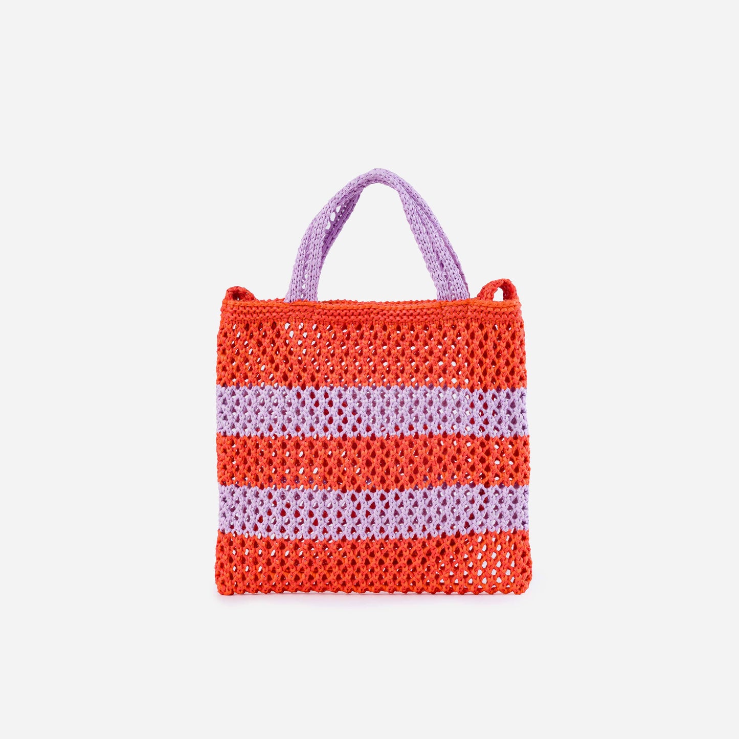 A little pop of color to hold all your daily essentials. Mini crochet-style bag made from raffia and yarn with knit flower detail, short double handles, and long strap. Wear it crossbody, as a shoulder bag, or with the strap tucked in for extra versatility. Closes with magnetic snap.
