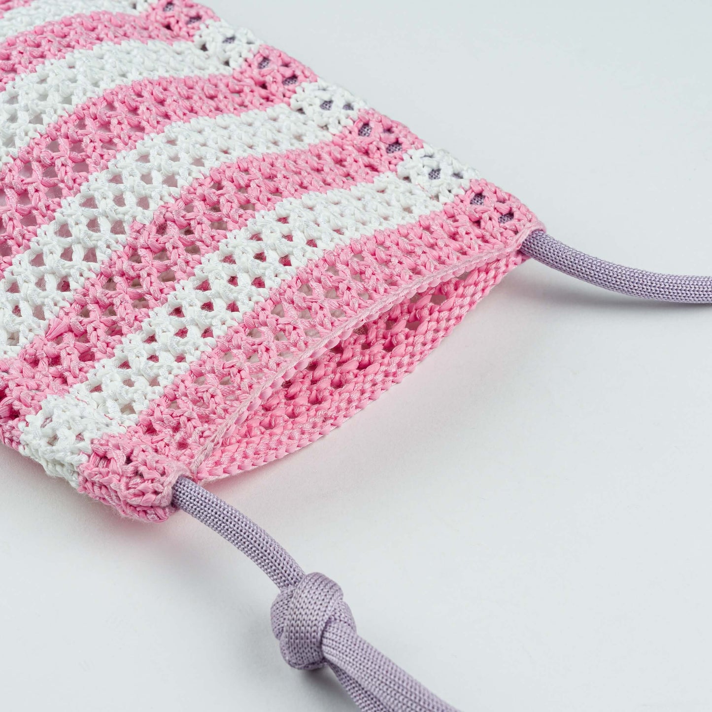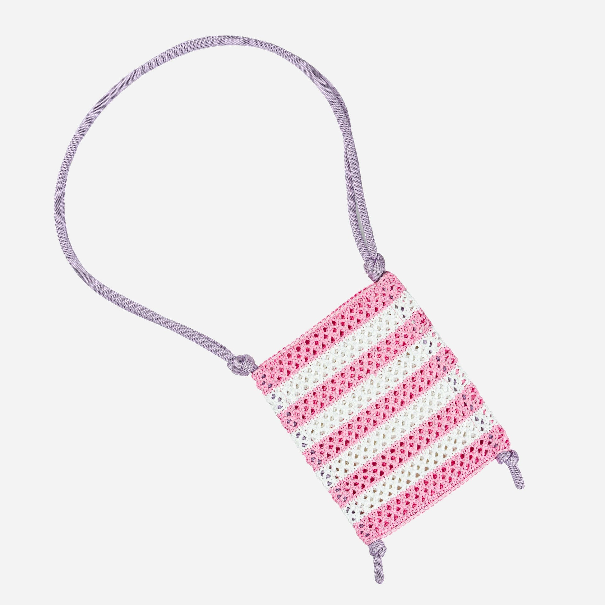 Easy, minimal, and bright striped phone sling made from raffia and yarn. Layer with your favorite bag, or wear it alone for a super streamlined fit. Sturdy crochet-style knit construction. Adjustable strap is made from repurposed yarn-stuffed cord and can be worn long or short for extra versatility.