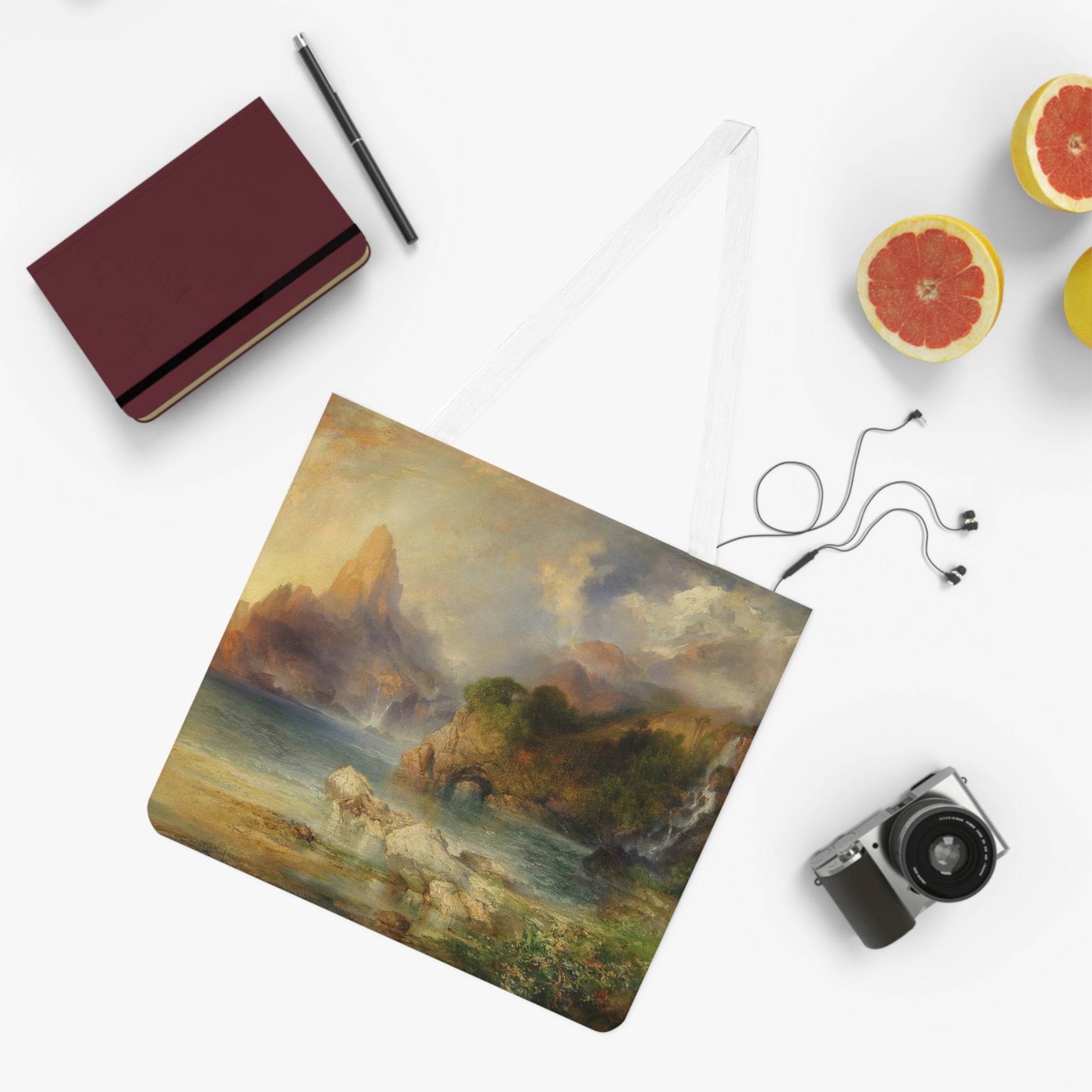 A cotton shoulder tote printed edge-to-edge with a soft, painterly coastal landscape. Warm sunlight spills over craggy cliffs and a quiet shoreline, giving the bag a romantic, vintage-art feel. The large, open interior carries market finds, sketchbooks, or beach-day essentials, while the long white handles make it easy to sling over your shoulder. Subtle reinforced stitching at the handles adds durability, and REACH-certified inks keep the colors true and safe. Bring a bit of wandering-seaside calm into everyday routines or relaxed weekend outings.